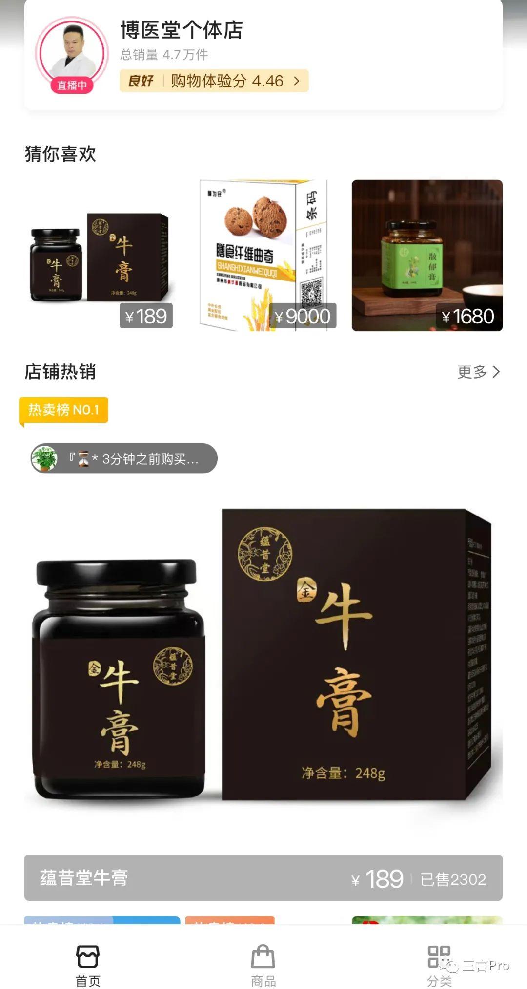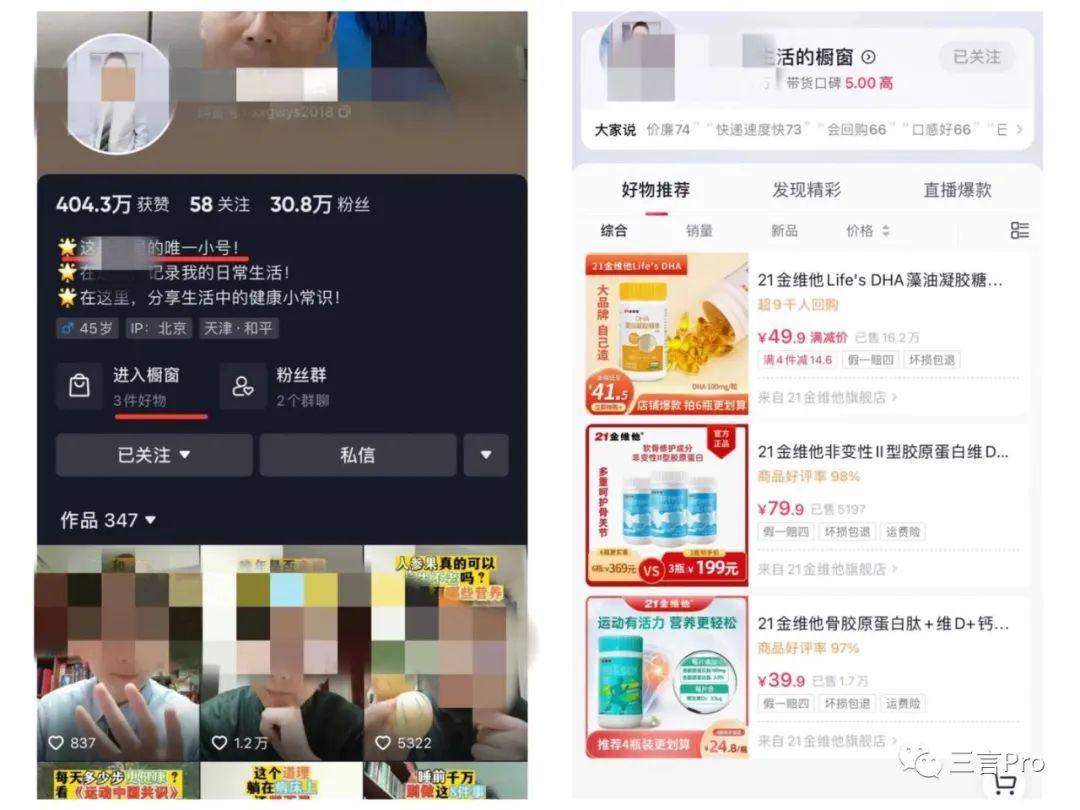 不同于抖音,快手中大多数医生账号都开通了橱窗功能,销售一些保健品。还有的医生干脆开始直播带货,售卖保健品。
