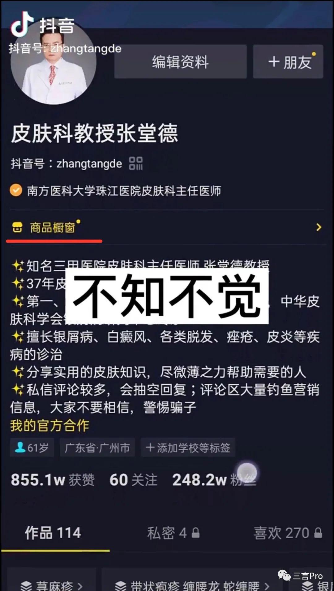 不过,笔者还发现,部分医生并非从未开通过橱窗带货,而是曾经开通但是目前已经关闭。从有的医生在此前发布的视频中能看出,其曾开通过橱窗,向粉丝销售商品;