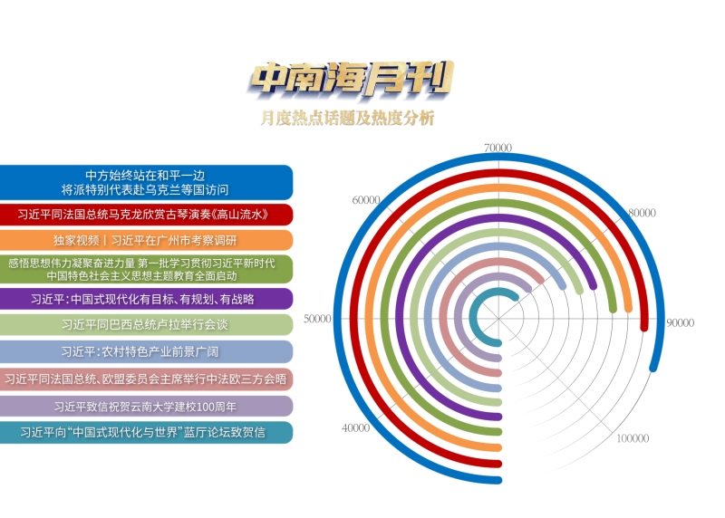 央视网“智闻”系统提取分析4月全网时政新闻热点显示,“中方始终站在和平一边,将派特别代表赴乌克兰等国访问”“中法元首非正式会晤”“习近平在广州市考察调研”等话题备受关注。