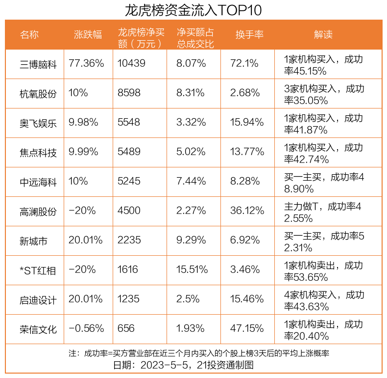 5月5日,上证指数下跌0.48%,深证成指下跌0.82%,创业板指下跌1.31%。盘后龙虎榜数据显示,共有27只个股因当日异动登上龙虎榜,资金净流入最多的是三博脑科(301293.SZ),达1.04亿元。