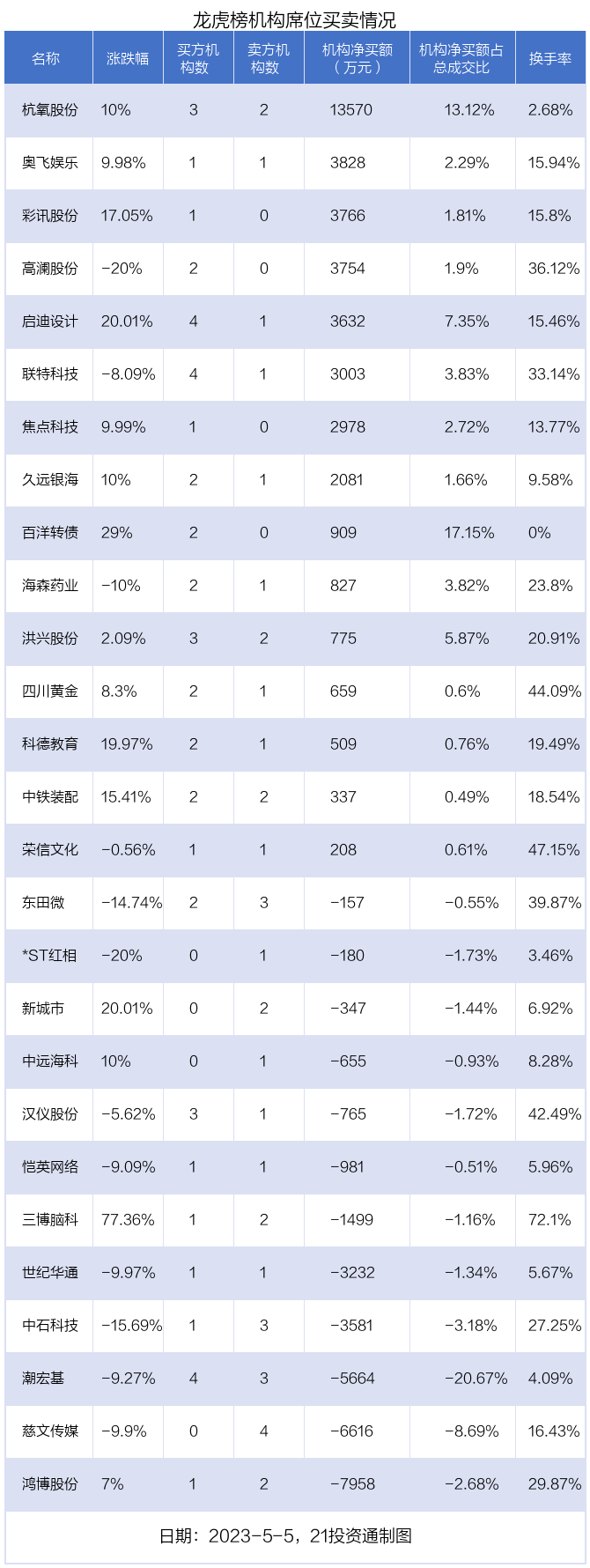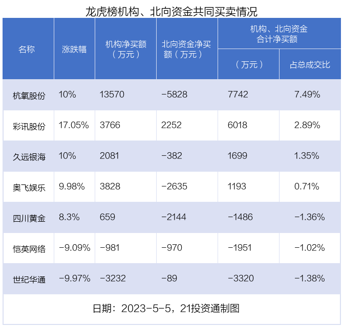 其中,机构净买入金额最多的是杭氧股份(002430.SZ),当日收盘上涨10%,换手率为2.68%。