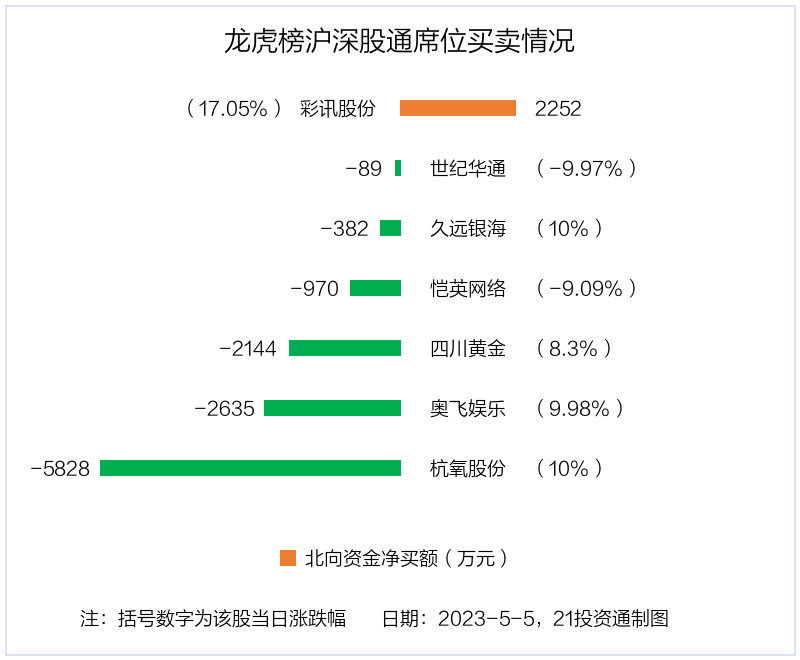 北向资金净买入金额最多的是彩讯股份(300634.SZ),净买入2252.05万元,占总成交金额的1.08%。净卖出金额最多的是杭氧股份(002430.SZ),为5827.74万元,占总成交金额的5.64%,当日收盘上涨10%,换手率为2.68%。