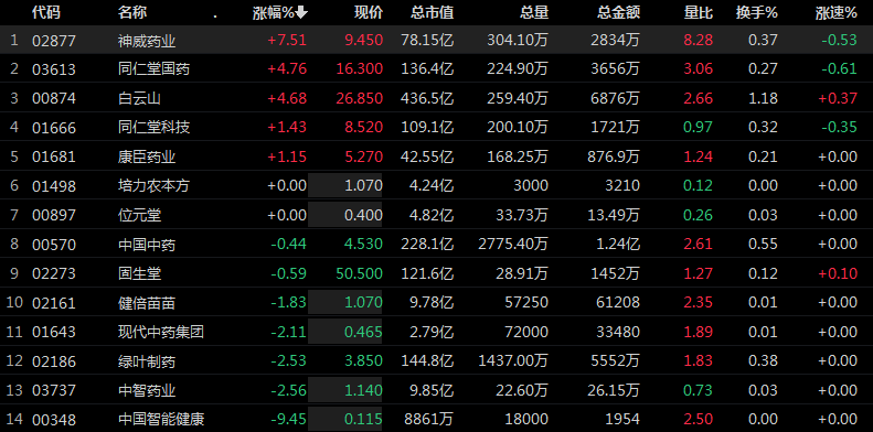 今日(5月8日),港股中医药板块个股分化。截至发稿,神威药业涨超7%,同仁堂国药涨近5%,白云山涨超4%。跌幅方面,中国智能健康跌超9%,中智药业、绿叶制药、现代中药集团等跌超2%。