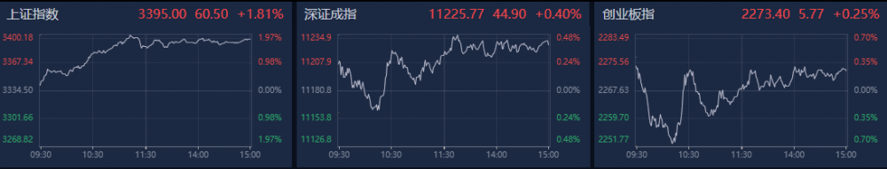 今日(5月8日),A股三大指数集体走高。上证指数涨近2%,创年内新高,盘中一度站上3400点。南财金融终端显示,截至收盘,上证指数涨1.81%,报收3395.00点;深证成指涨0.40%,报收11225.77点;创业板指涨0.25%,报收2273.40点。