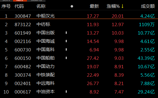 中字头个股大涨,中船汉光“20CM”涨停,中纺标涨超10%,中国出版、中国海诚、中国高科涨停,中国船舶、中国动力、中铁装配、中远海科纷纷跟涨。