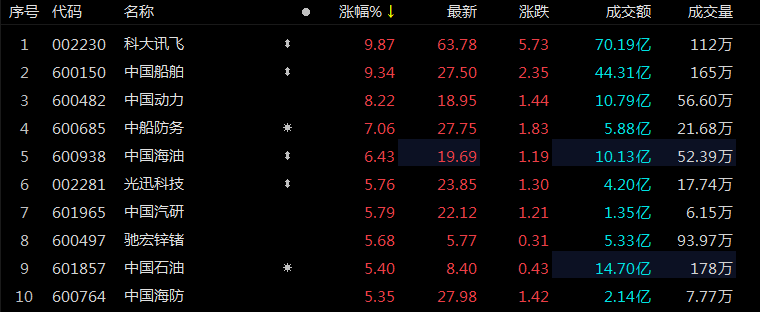 成分股方面,除了中国船舶外,第一大重仓的科大讯飞盘中一度涨停,现涨超9%,中国动力、中船防务、中国海油、光迅科技、中国汽研、驰宏锌锗、中国石油、中国海防等纷纷跟涨。