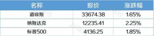 上周五,美股三大指数集体收涨,截至收盘,道指涨1.65%,纳指涨2.25%,标普500指数涨1.85%。
