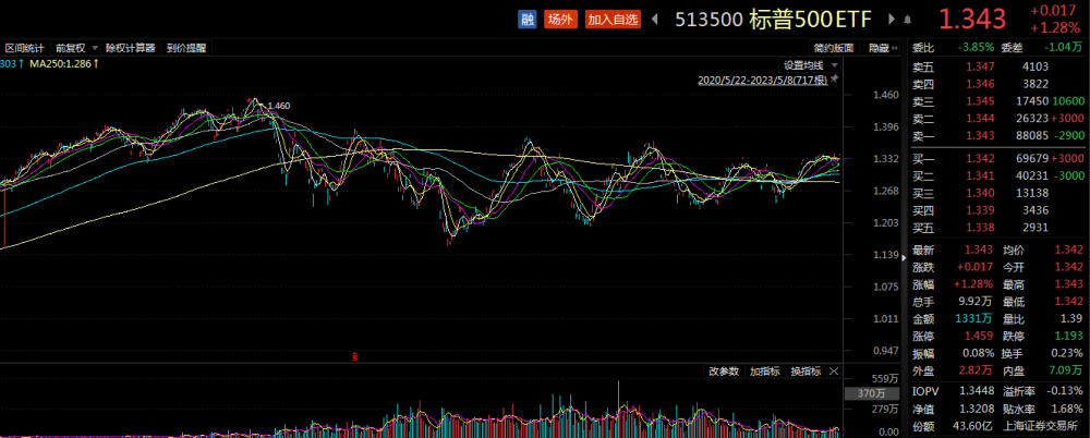 ETF方面,标普500ETF(513500)今日高开,截至发稿,该ETF涨1.28%,成交额突破1300万元。
