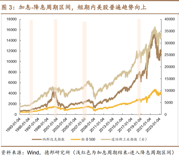德邦证券复盘1990年至今4轮美联储完整加息周期并称,加息结束至降息开始区间内,美股短期内普遍趋势向上,美债利率普遍下行,美元指数大多下行,黄金大多上行,原油、铜等大宗商品趋势并不明显。