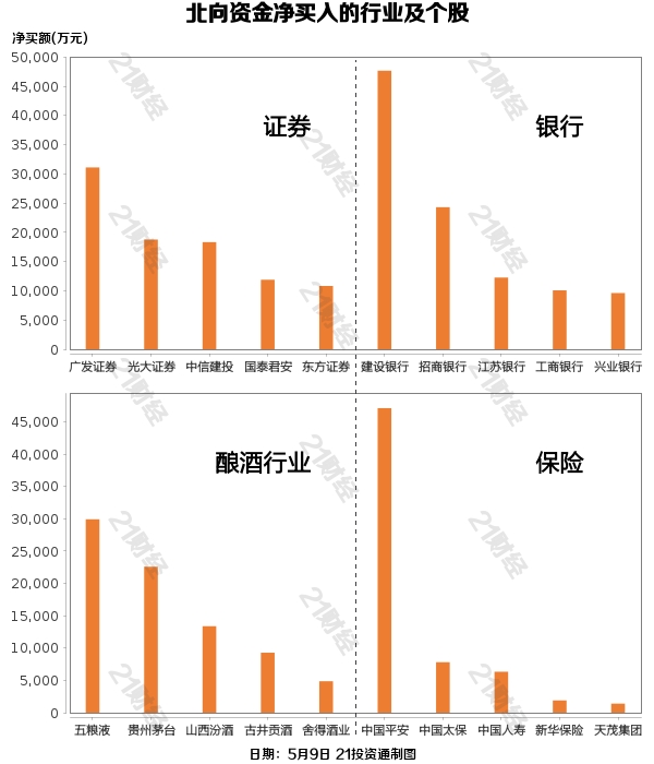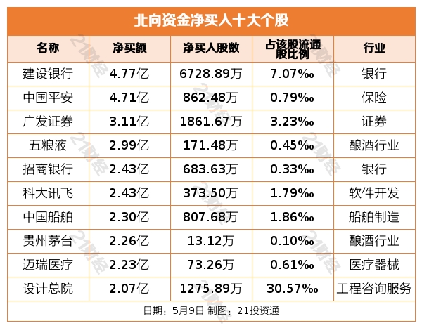 个股方面,北向资金净买入建设银行(601939.SH)、中国平安(601318.SH)、广发证券(000776.SZ)、五粮液(000858.SZ)、招商银行(600036.SH)居前,其中,建设银行被净买入4.77亿元,中国平安被净买入4.71亿元,广发证券被净买入3.11亿元,五粮液被净买入2.99亿元,招商银行被净买入2.43亿元。