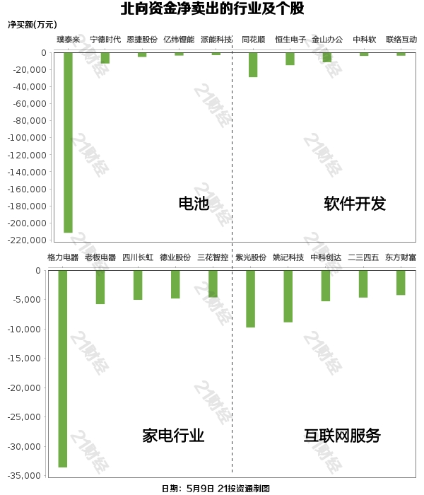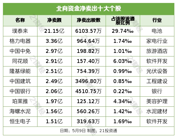 北向资金净卖出璞泰来(603659.SH)、格力电器(000651.SZ)、中国中免(601888.SH)、同花顺(300033.SZ)、隆基绿能(601012.SH)居前,其中,璞泰来被净卖出21.15亿元,格力电器被净卖出3.36亿元,中国中免被净卖出2.97亿元,同花顺被净卖出2.91亿元,隆基绿能被净卖出2.51亿元。