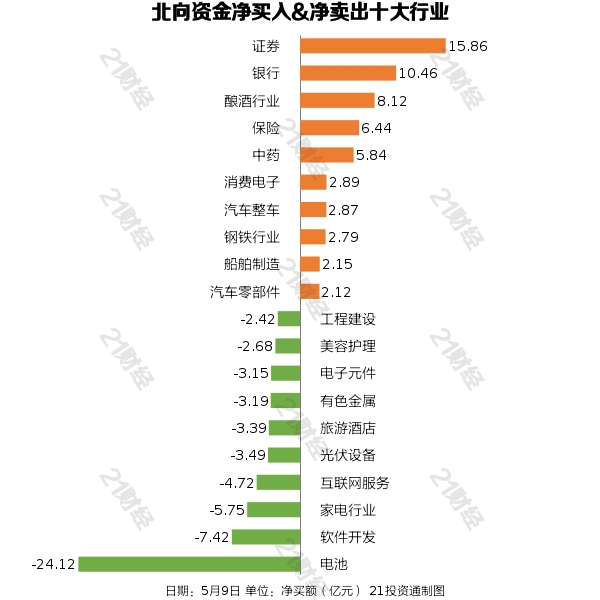 从净买入金额来看,北向资金增持了44个行业,其中证券居首,净买入金额达15.86亿元,其次是银行行业,净买入10.46亿元。北向资金减持了56个行业,其中电池最多,净卖出金额达24.12亿元,其次是软件开发行业,净卖出7.42亿元。