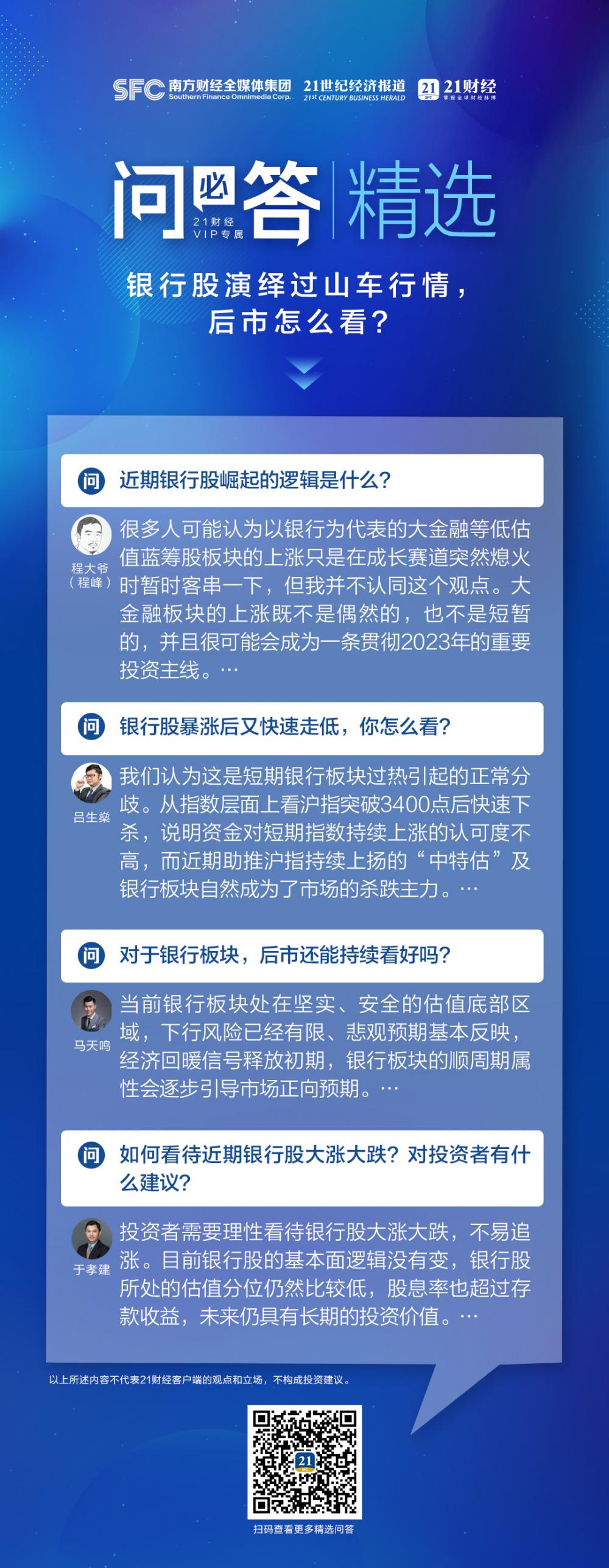 近期,银行股表现备受市场关注,在暴涨之后又出现快速回调,演绎了一波过山车行情。那么,银行股本轮崛起的逻辑是什么?后市还能持续看好吗?21财经“问必答”特邀南财号平台财经领域专家进行分析解读,希望能帮您解开疑惑。点击提问>>