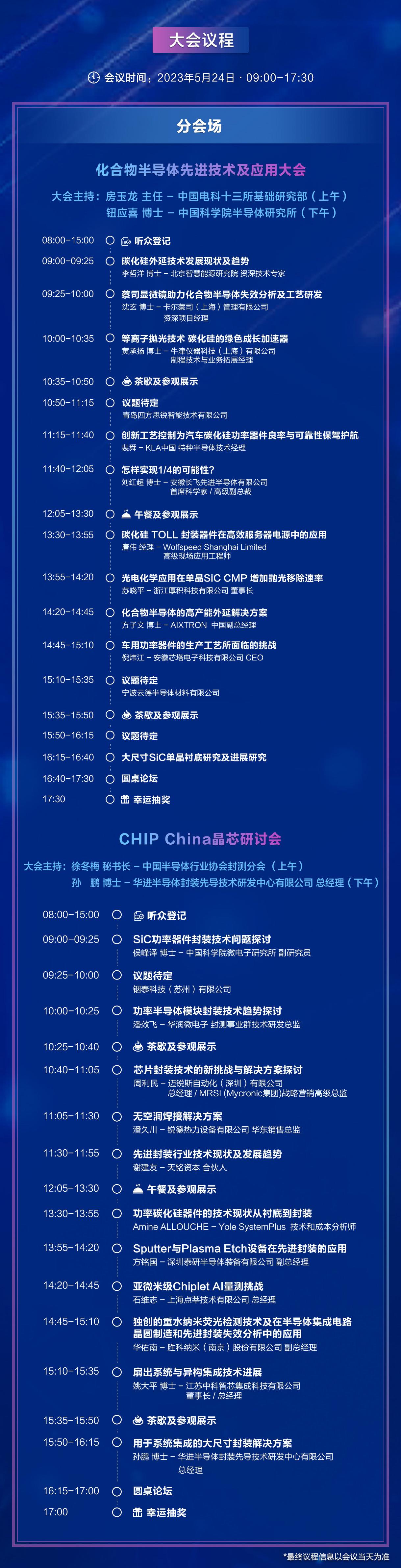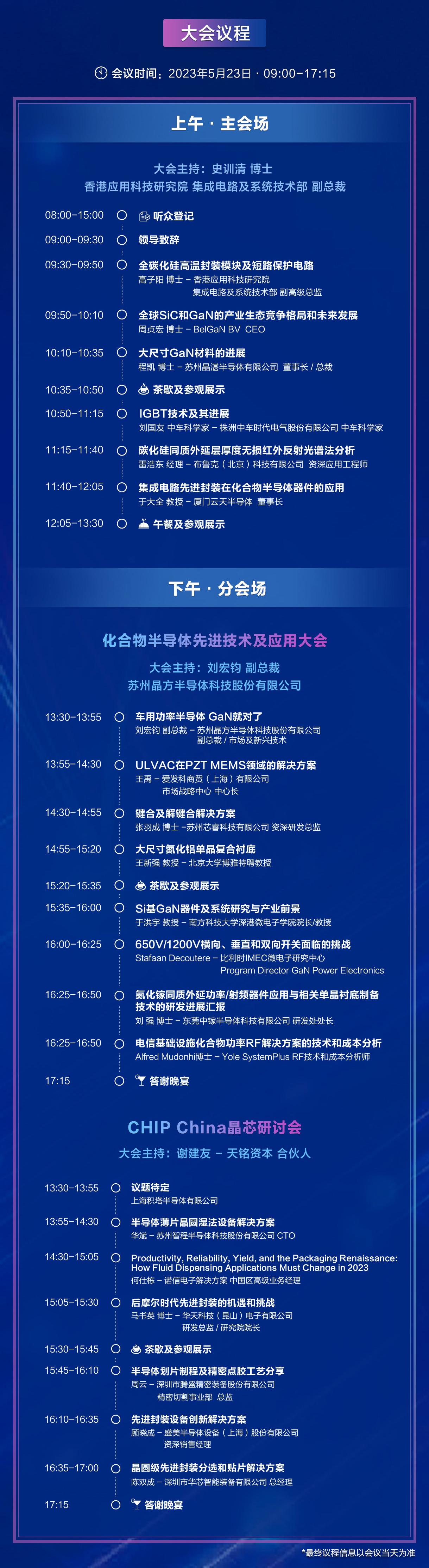 把握机遇,凝聚向前。雅时国际将于2023年5月23-24日,在苏州组织举办主题为“2023-半导体先进技术创新发展和机遇大会”。会议包括两个专题:半导体制造与封装、化合物半导体先进技术及应用。分别以“CHIP China晶芯研讨会”和“化合物半导体先进技术及应用大会”两场论坛的形式同时进行。展开泛半导体产业高端对话,促进参会者的交流信息与合作。