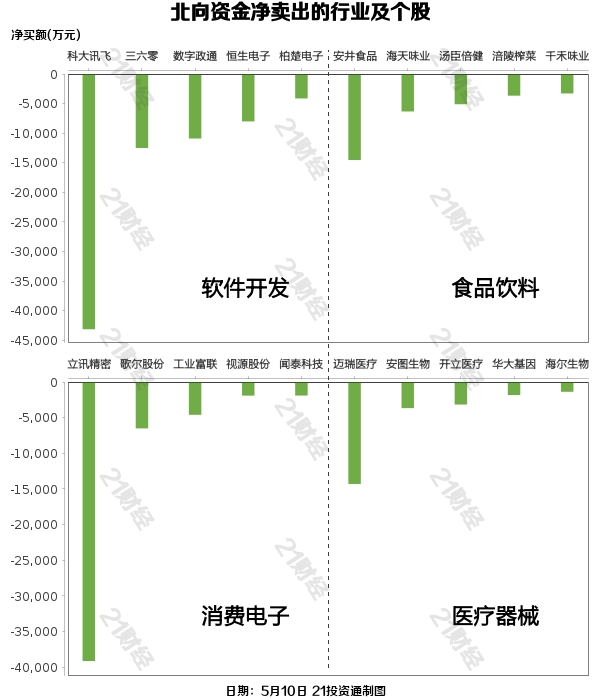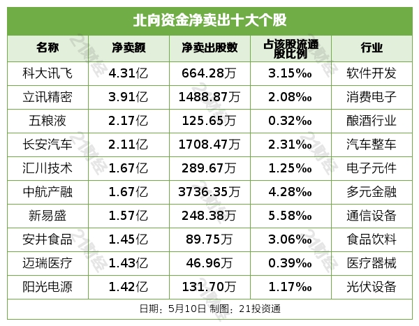 北向资金净卖出科大讯飞(002230.SZ)、立讯精密(002475.SZ)、五粮液(000858.SZ)、长安汽车(000625.SZ)、汇川技术(300124.SZ)居前,其中,科大讯飞被净卖出4.31亿元,立讯精密被净卖出3.91亿元,五粮液被净卖出2.17亿元,长安汽车被净卖出2.11亿元,汇川技术被净卖出1.67亿元。