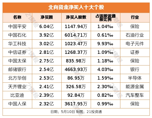 个股方面,北向资金净买入中国平安(601318.SH)、中国石化(600028.SH)、华工科技(000988.SZ)、中信证券(600030.SH)、中国太保(601601.SH)居前,其中,中国平安被净买入6.04亿元,中国石化被净买入3.92亿元,华工科技被净买入3.02亿元,中信证券被净买入2.81亿元,中国太保被净买入2.75亿元。