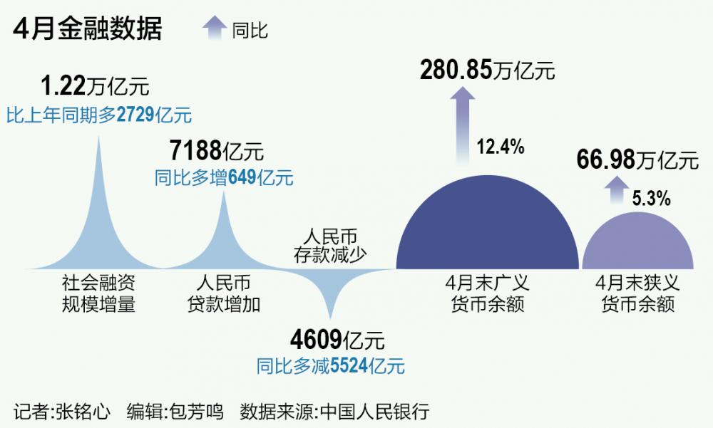 对于M2增速回落的原因,中国民生银行首席经济学家温彬认为,一方面4月居民存款减少1.2万亿元,同比多减4968亿元,主要是在资本市场和理财市场回暖背景下,居民储蓄有所分流;另一方面4月份财政存款增加5028亿元,同比多增4618亿元,财政资金回笼也制约了M2增长。下阶段,受去年基数逐月抬升的影响,预计M2增速还将回落。