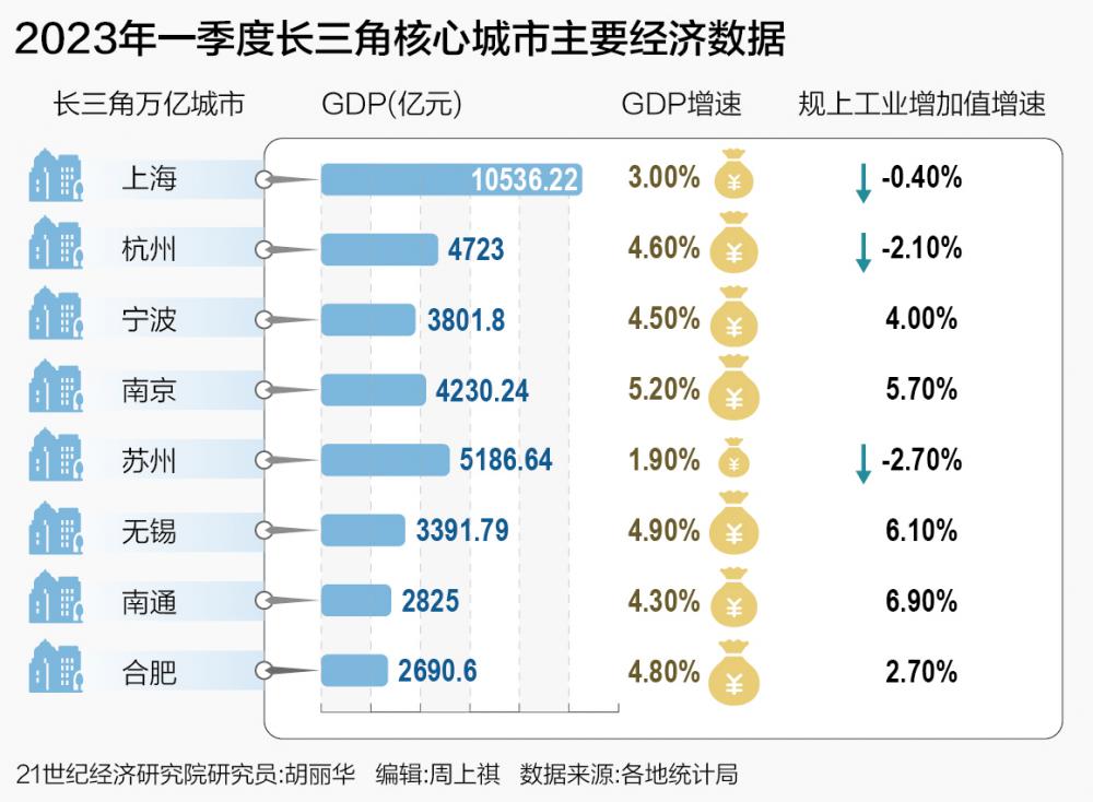 21世纪经济研究院梳理发现,苏皖浙一季度规上工业增加值分别同比增长5.5%、4.2%和3%,均不低于3%的全国平均增速。同期,上海全市规模以上工业增加值同比下降0.4%,降幅比去年全年收窄0.2个百分点。