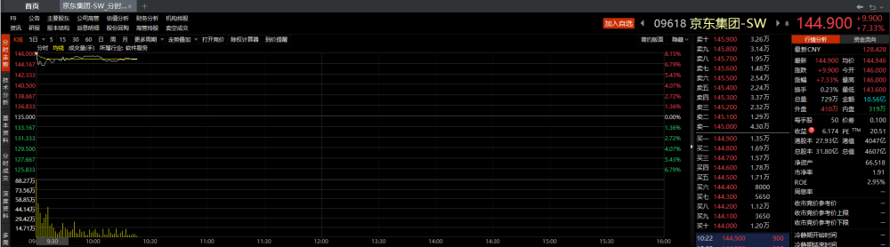 受一季度同比扭亏为盈刺激,隔夜京东集团(JD.Nasdaq)美股大涨7.21%。今日港股市场上,京东集团(9618.HK)同样大幅走强,发稿时涨幅为7.33%。