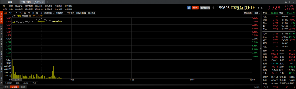 隔夜中概股同样走势强劲。纳斯达克金龙中国指数收涨3.82%。成分股中,达达收涨19.43%领跑,唯品会涨8.29%,好未来涨8.04%,拼多多涨7.05%。相关ETF方面,中概互联ETF(159605)今日大幅高开后强势震荡,截至发稿时,涨幅超3%。成交量继续活跃,成交金额近8亿元,换手率为13.72%。