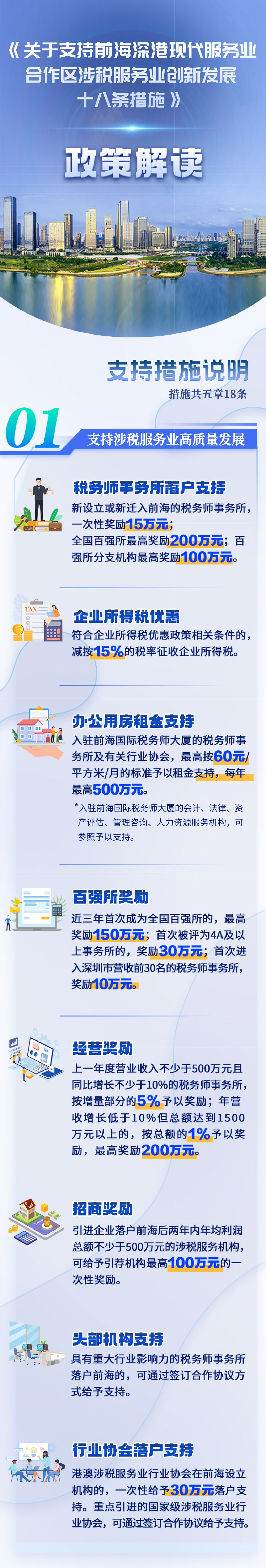18.提供综合服务保障。支持在前海设立深圳涉税服务从业人员服务中心,提供“一揽子”服务;支持举办国家级涉税服务业相关会议、论坛及涉税服务业行业展会;支持在前海建设国家级实体化涉税服务从业人员教育基地,加强业务培训;对前海涉税服务机构的从业人员,在人才住房、子女就学等方面按照现有规定予以政策保障。