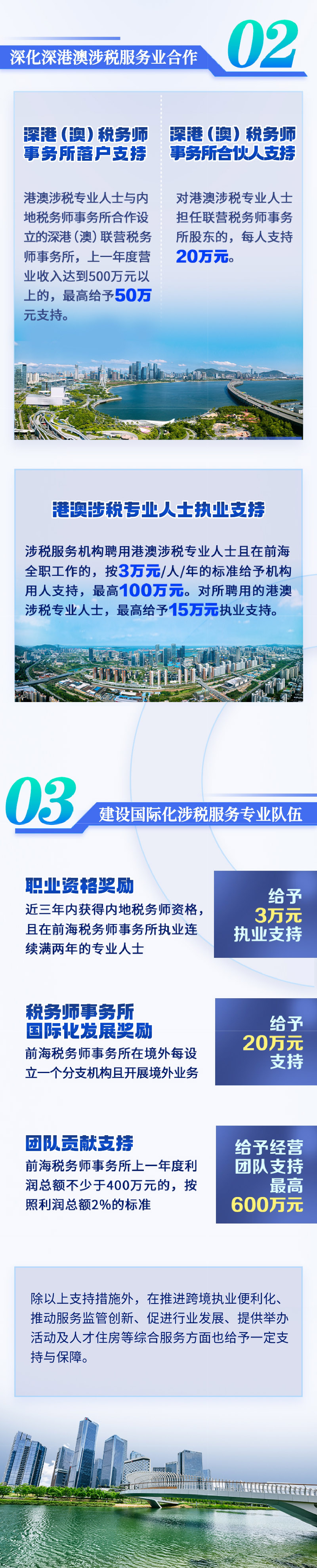 对港澳涉税专业人士担任深港(澳)联营税务师事务所股东的,每人一次性支持20万元,每家机构最多支持3人。