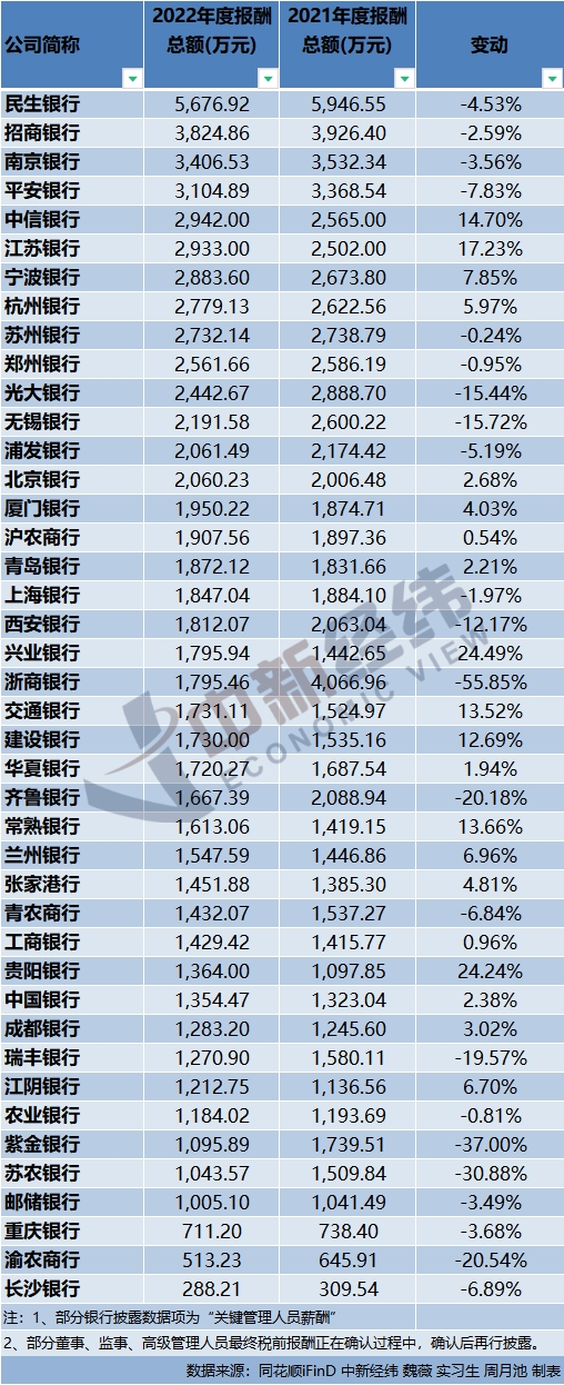 从目前已披露的数据看,2022年度银行管理层报酬总额前十的银行中,4家为股份制银行、6家为城商行。最高的三家为民生银行、招商银行和南京银行,分别为5676.92万元、3824.86万元和3406.53万元,但三家银行均较2021年出现下滑,降幅分别为4.53%、2.59%和3.56%。
