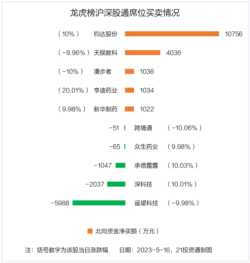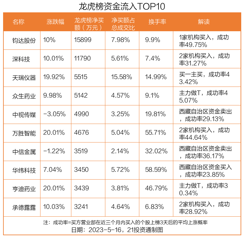 5月16日,上证指数下跌0.6%,深证成指下跌0.71%,创业板指下跌0.25%。盘后龙虎榜数据显示,共有47只个股因当日异动登上龙虎榜,资金净流入最多的是钧达股份(002865.SZ),达1.59亿元。