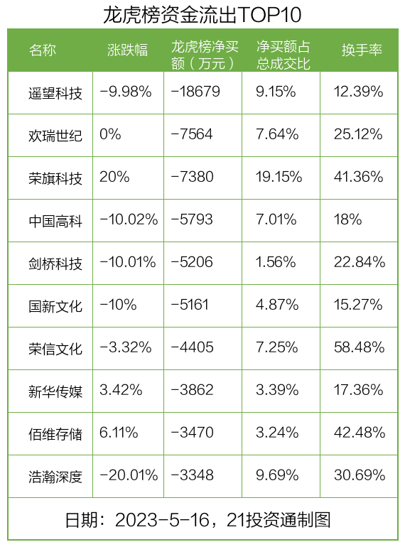 而龙虎榜中资金净流出最多的是遥望科技(002291.SZ),被净卖出为1.87亿元,占总成交金额的9.15%。遥望科技收盘下跌9.98%,换手率为12.39%。