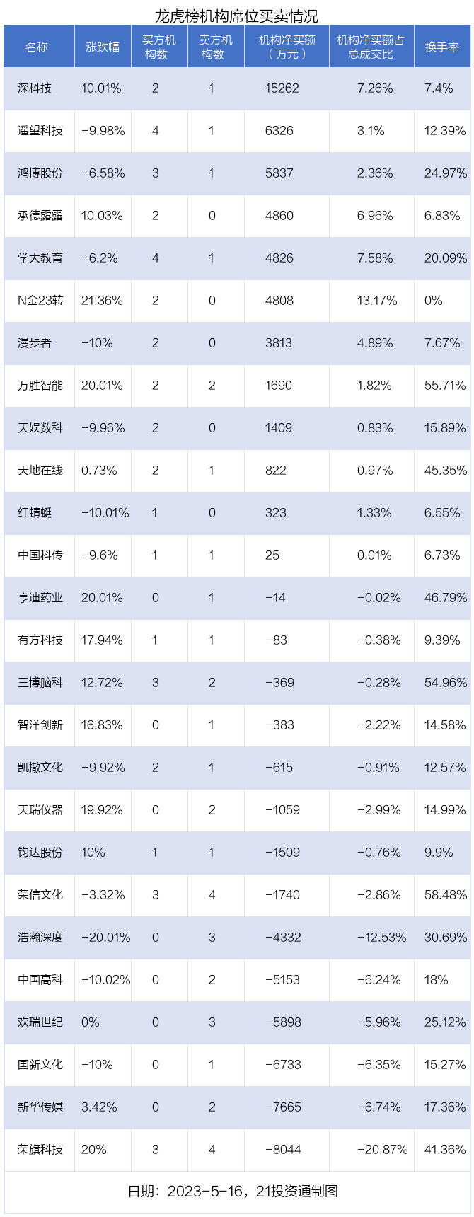 其中,机构净买入金额最多的是深科技(000021.SZ),当日收盘上涨10.01%,换手率为7.4%。