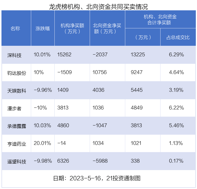 值得注意的是,机构和北向资金共同净买入了天娱数科、漫步者等2股;在钧达股份,亨迪药业,承德露露,深科技,遥望科技上出现分歧,机构净卖出钧达股份1508.83万元,北向资金净买入1.08亿元;机构净卖出亨迪药业13.78万元,北向资金净买入1034.41万元;机构净买入承德露露4860.28万元,北向资金净卖出1047.5万元;机构净买入深科技1.53亿元,北向资金净卖出2037.28万元;机构净买入遥望科技6325.71万元,北向资金净卖出5988.13万元。