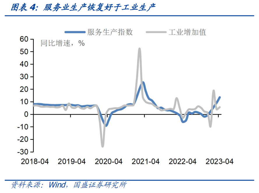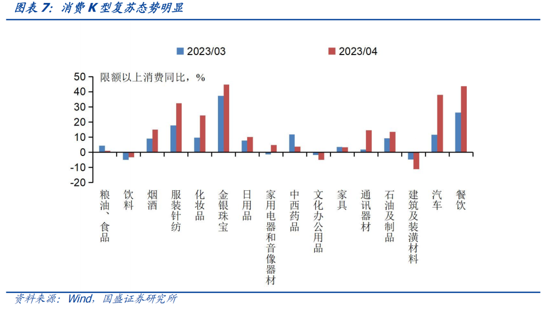 社零恢复节奏放缓,服务业消费恢复好于商品消费。4月社会消费品零售同比增长18.4%,增速较3月提升7.8个百分点,环比增长0.5%,较上月下降0.3个百分点。社零同比增速的高增,主要系2022年低基数所致,但消费复苏整体相对较强,从环比折年率数据看,社零可能仍然高于潜在经济增速。同时,在总体收入恢复缓慢和“疤痕效应”下,预计消费潜力进一步释放的空间有限。从边际趋势上看,环比走弱,同时我们将社零季调换算成指数后,4月的两年年化同比增速为3.3%(前值为3.2%),也可以看出消费复苏的节奏放缓。从分项看,服务类消费恢复好于商品消费,餐饮收入同比为43.8%,好于社零整体的恢复,服务业生产指数同比增长13.5%,也显示服务业生产恢复较好;升级类商品销售增长较快,限额以上金银珠宝类、体育娱乐用品类、化妆品类商品零售额分别增长44.7%、25.7%、24.3%,消费K型分化的趋势明显,耐用品消费中的汽车当月同比增速38%,较前值提升26.5个百分点,国6b标准落地在即,汽车消费增长超出市场预期,汽车降价促销的现象可能得以缓解。