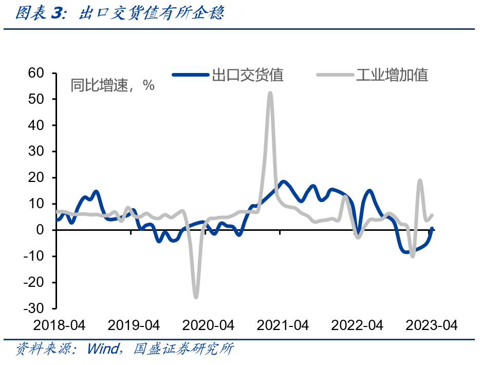 工业表现持续低于预期,出口交货值开始有所企稳。4月工业增加值同比增长5.6%,较3月小幅提升1.7个百分点,环比下降0.5%。在2022年4月基数较弱的情况下,工业增加值的表现低于预期。同时出口交货值开始有所企稳,产成品存货持续去库下,出口的需求韧性开始向生产端传导。
