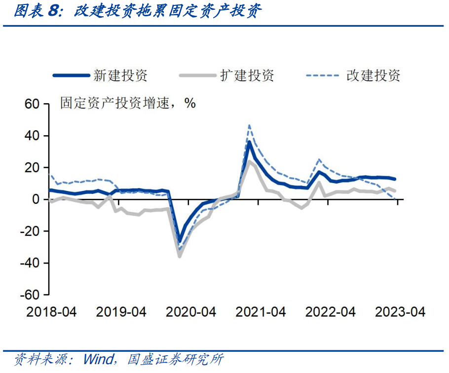 制造业与基建增速放缓,关注未来收敛的速度。4月固定资产投资当月同比3.9%,较上月回落0.9个百分点,季调环比-0.6%。从构成上看,固投走弱主要为支持设备改造的政策逐步退出后,改建投资大幅走弱,而在2022年,改建投资增速曾超过20%。随着政策节奏放缓,关注制造业和基建投资收敛的速度。