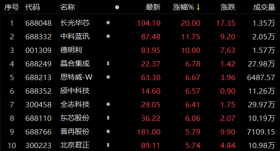 半导体板块其他个股中,长光华芯20cm涨停,德明利封板,中科蓝讯涨近12%,晶合集成、思特威、颀中科技、全志科技、东芯股份涨逾6%。