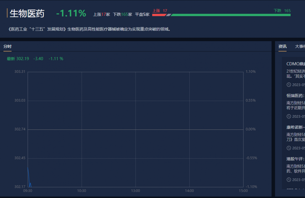 5月24日生物医药板块低开。南财金融终端主题库显示,生物医药主题开盘下跌1.11%。成分股中,泓博医药、百奥泰跌超5%,川宁生物跌超4%,神州细胞、中国医药、长春高新、君实生物等多股下跌;上涨方面,仅华通热力、特一药业、赛升药业、凯赛生物等10余股小幅上涨。