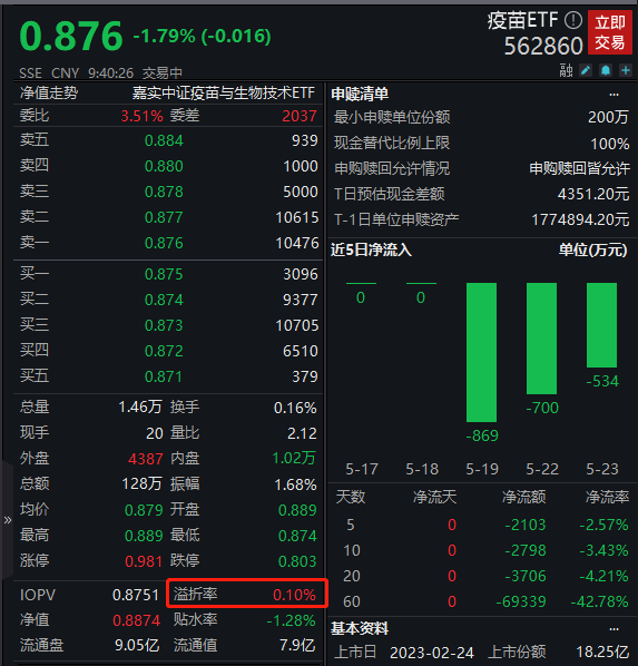ETF方面,跟踪中证疫苗与生物技术指数(931992.CSI)的疫苗ETF(562860)今日走低,早盘一度跌超2%。截至发稿,疫苗ETF(562860)跌幅收窄至1.79%,溢折率0.10%,溢价交易。