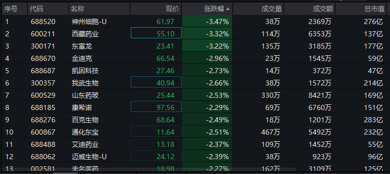 成分股中,神州细胞-U、西藏药业、东富龙跌超3%,金迪克、凯因科技、我武生物、康希诺等多股跌超2%。