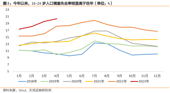 从财政支出的结构来看,财政支出的力度向民生领域有所倾斜。今年以来,一般公共预算支出中,社保和就业方面支出的占比处于近 5 年以来同期最高水,1-4 月累计占比较去年同期提升 0.6 个百分点,我们认为财政对稳就业的加码在一定程度上挤出了财政对基建的投资。