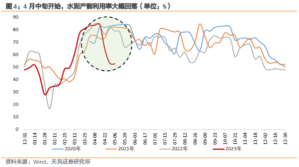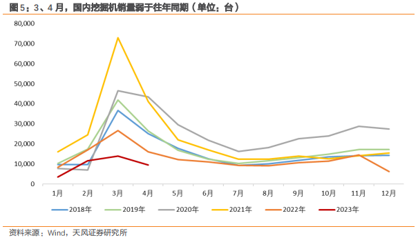 实际上,基建投资的放缓在与基建相关的螺纹钢、沥青、水泥等上游产品的高频数据中也早有体现。去年 4 月是基建投资的低点,然而当前螺纹钢的表观需求量仅持平去年同期,石油沥青开工率仅略高于去年同期,而水泥熟料产能利用率甚至大幅低于去年同期26 个百分点。今年 3 月和 4 月国内挖掘机销量也大幅弱于往年同期水平。在去年同期存在疫情影响的情况下,今年基建相关的上游产品的高频数据仅与去年同期大致相当,充分体现了当前基建投资的放缓幅度。