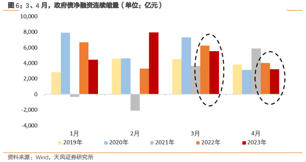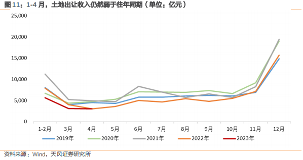 而这恰恰可能是潜在的风险点。根据我们此前预测,今年土地出让金可能再次负增长(详见《算算今年的财政空间——2023 年财政政策展望》,2023.2.22)。今年 1-4 月全国土地出让收入 11761 亿元,同比下降 21.7%。通常情况下,1-4 月土地出让收入占全年比重 20%以上,如果全年土地出让节奏和过去两年持平,预计全年土地出让收入在 5 万亿元左右,较去年下滑 1.7 万亿元。如果接下来没有增量政策工具作补充,这意味着今年地方政府在基建投资上可能还会面临着财政预算不足的压力。