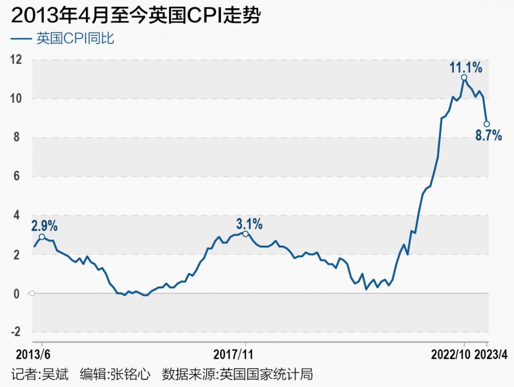 中国银行研究院高级研究员王有鑫对21世纪经济报道记者分析称,英国4月通胀率在连续7个月超过10%后降至8.7%,说明通胀压力得到部分缓解。但值得关注的是,一方面,通胀回落速度不及预期,8.7%的数据远高于市场预期;另一方面,核心通胀率从6.2%升至6.8%,反映英国通胀压力仍然较大,具有较强的粘性。
