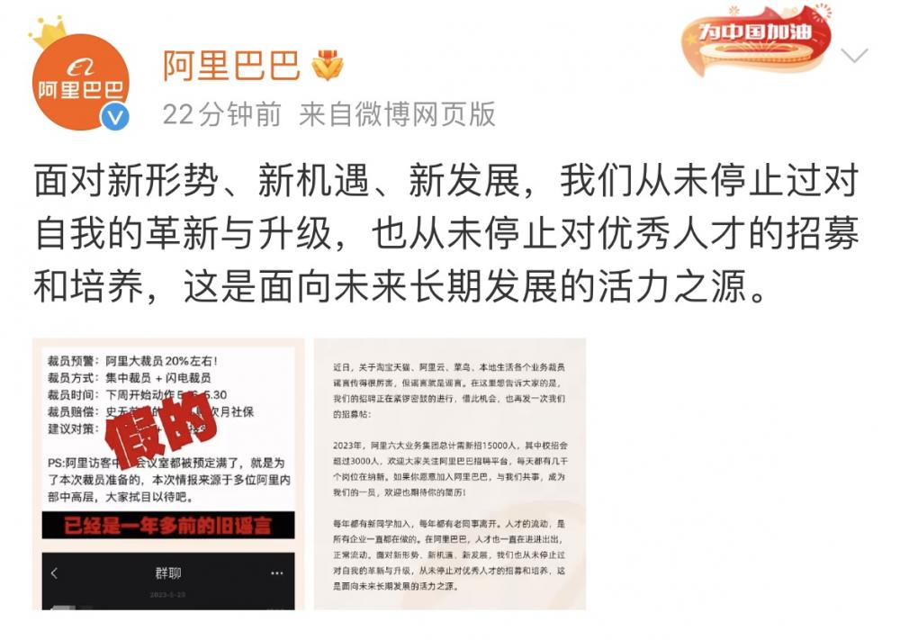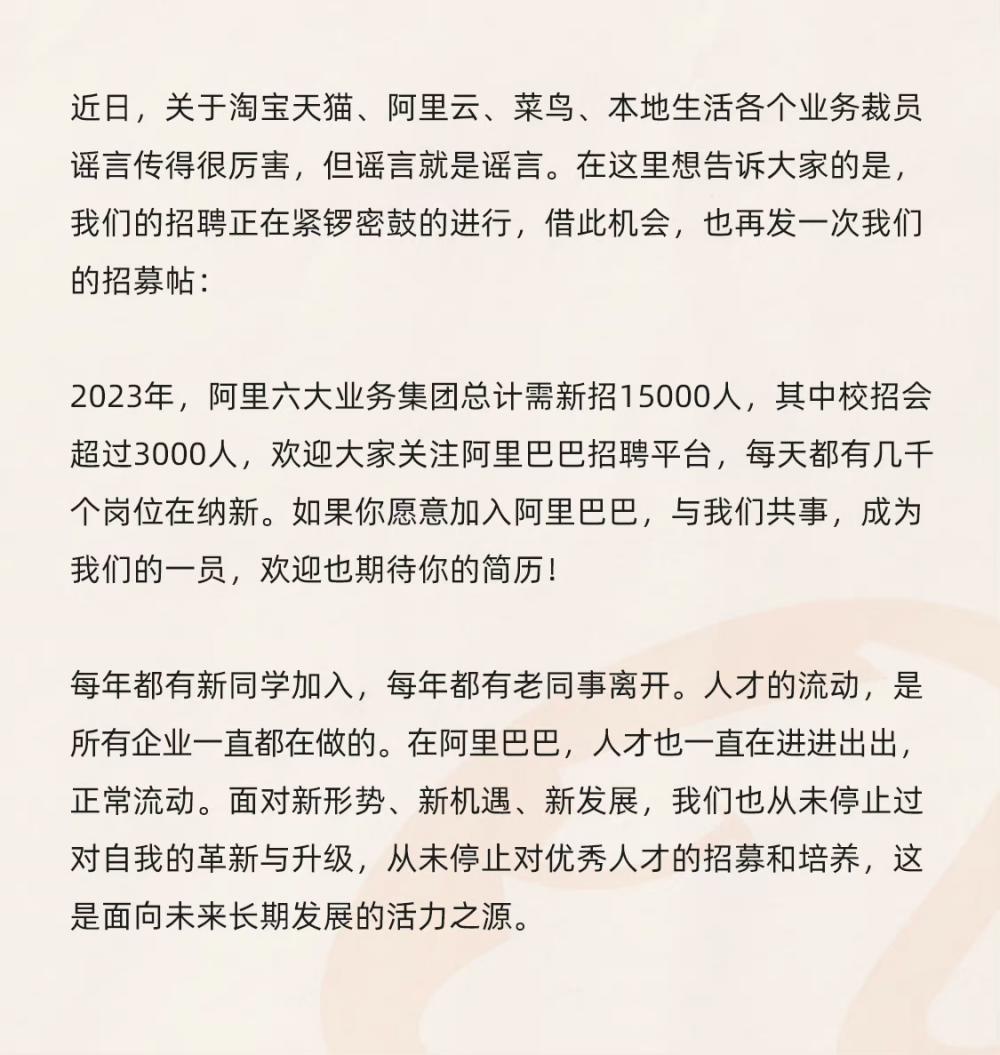 阿里巴巴集团官微宣布,2023年六大业务集团总计需新招15000人,其中校招超过3000人。同时表示,“近日,关于淘宝天猫、阿里云、菜鸟、本地生活各个业务裁员谣言传得很厉害,但谣言就是谣言。我们的招聘正在紧锣密鼓的进行。”