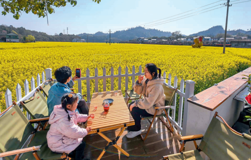 杭州市临安区太阳镇太阳米基地旁的一家民宿餐厅,客人在院子里喝茶赏景(2023年3月28日摄)徐昱摄/《瞭望》