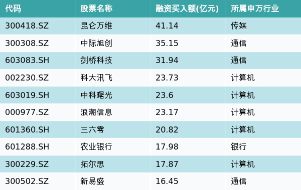 上周两市共有3161只个股有融资资金买入,共有33只个股买入金额超10亿元,其中昆仑万维、中际旭创、剑桥科技排名前三,买入金额分别41.14亿元、35.15亿元、31.94亿元。融资买入额前10个股详情见下表: