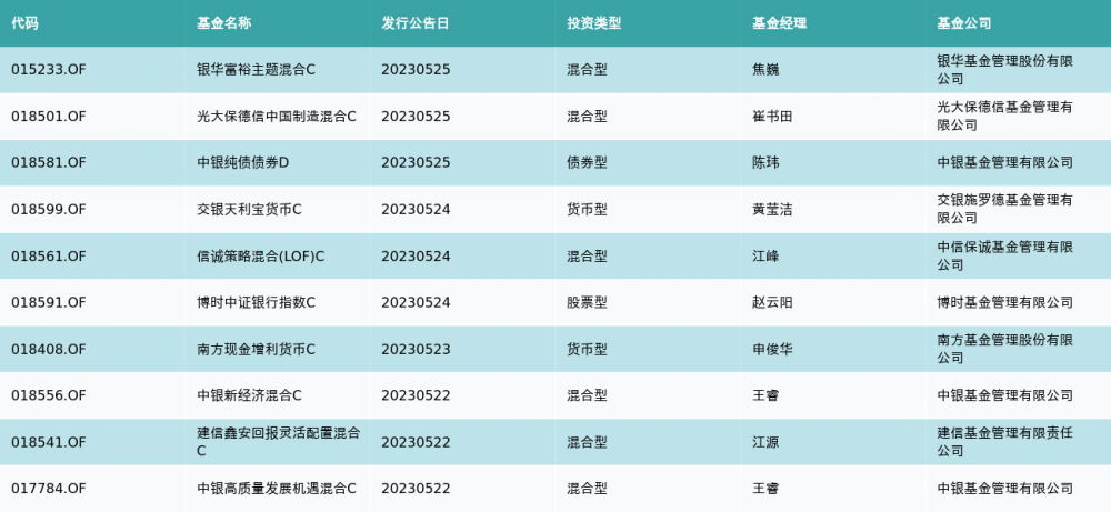 上周有10只新基金发行,分别为:银华富裕主题混合C、光大保德信中国制造混合C、中银纯债债券D、交银天利宝货币C、信诚策略混合(LOF)C、博时中证银行指数C、南方现金增利货币C、中银新经济混合C、建信鑫安回报灵活配置混合C、中银高质量发展机遇混合C,详情见下表: