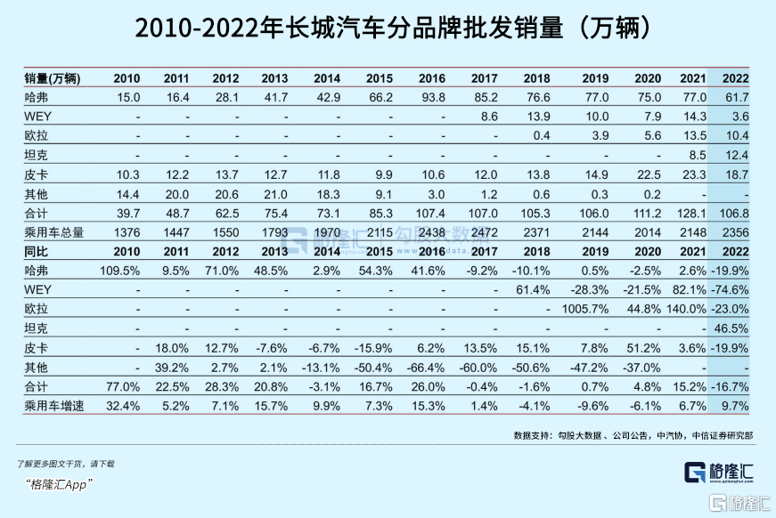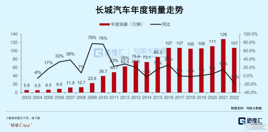 根据券商的梳理,长城汽车也曾经有过非常高速的销量增长期,但是到了2016年首次突破百万规模后,随着新能源车的开始普及,其销量便开始骤然放缓,此后几年一直几乎没有增长。