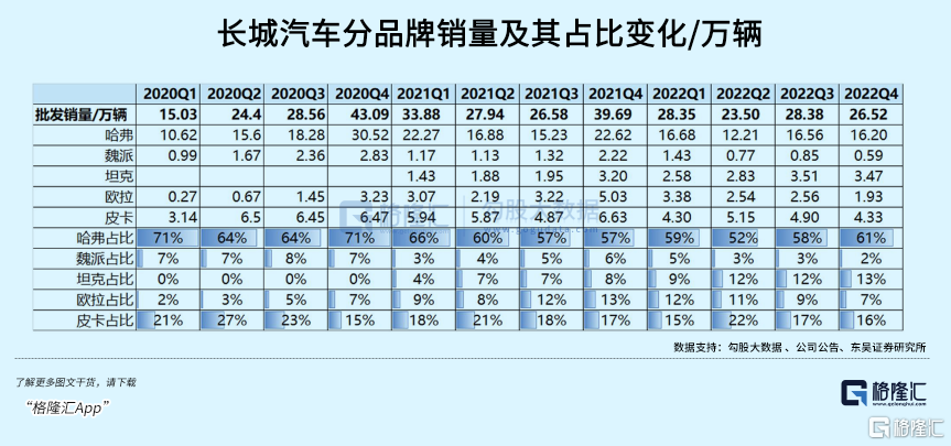 在其中,长城汽车虽然也实施了多品牌策略,推出过不少款一度受到关注的车型,包括推出过几款新能源车品牌,但在销量上却是大多数都是不温不火。导致这么多年来,依然只有哈佛系列作为关键销量担当,占比长期超过总量的一半。