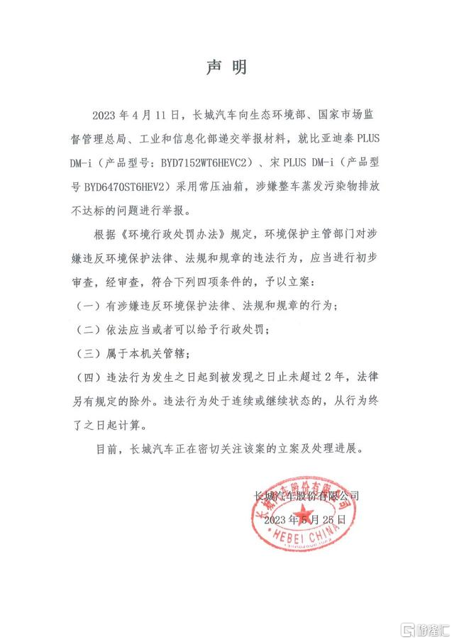 长城汽车发布声明,4月11日,长城汽车向生态环境部、国家市场监督管理总局、工业和信息化部递交举报材料,就比亚迪秦PLUSDM-i、宋PLUS DM-i采用常压油箱,涉嫌整车蒸发污染物排放不达标的问题进行举报。