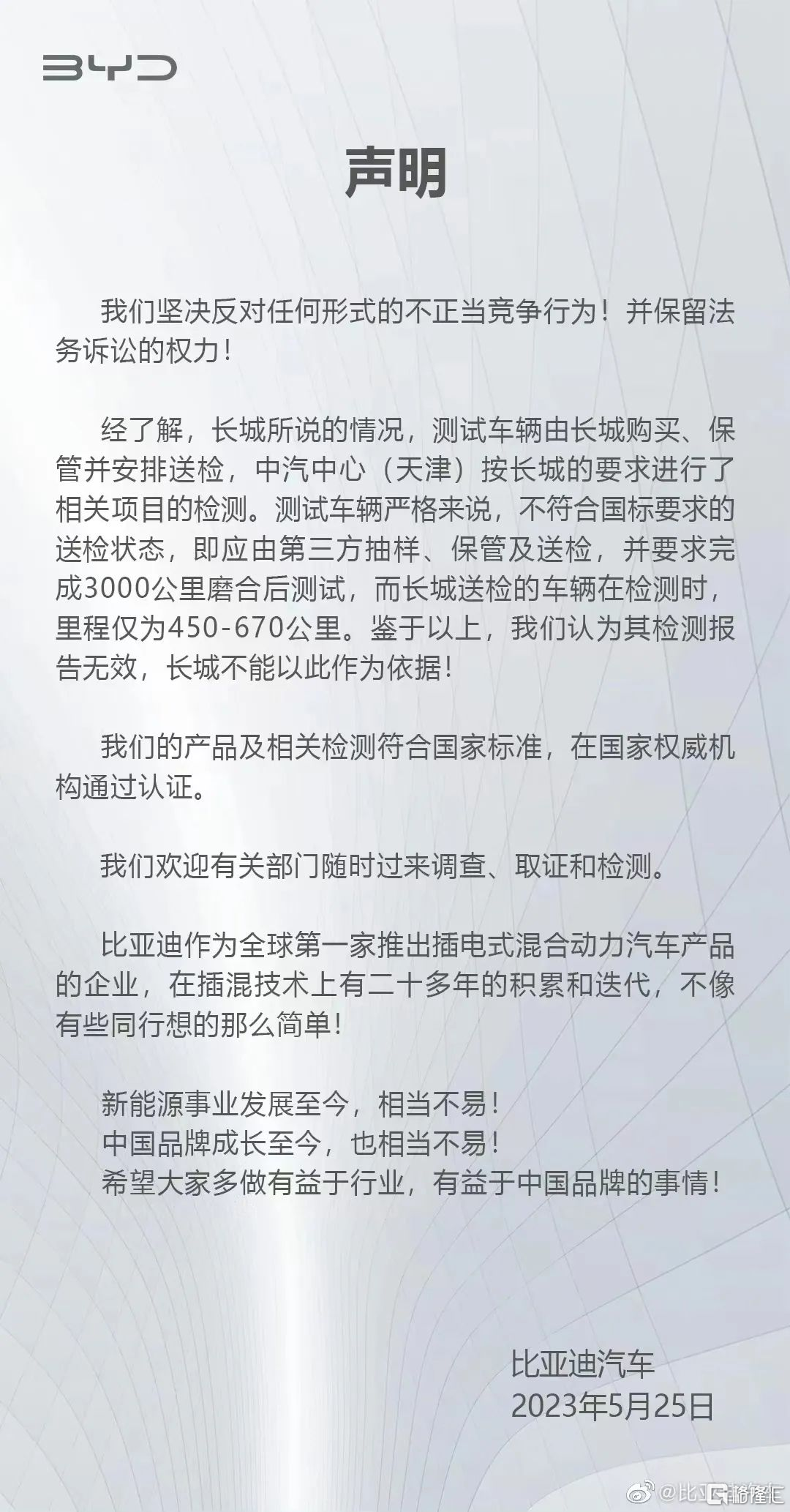 对方说到这份上,比亚迪当然也不会闲着。长城的声明刚出,比亚迪就火速回应: